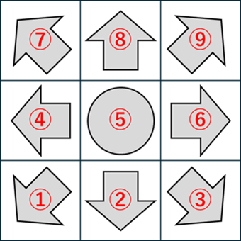 ちなみに格闘ゲームのコマンドの矢印と数字の関係性は以下の画像のとおりとなっています。